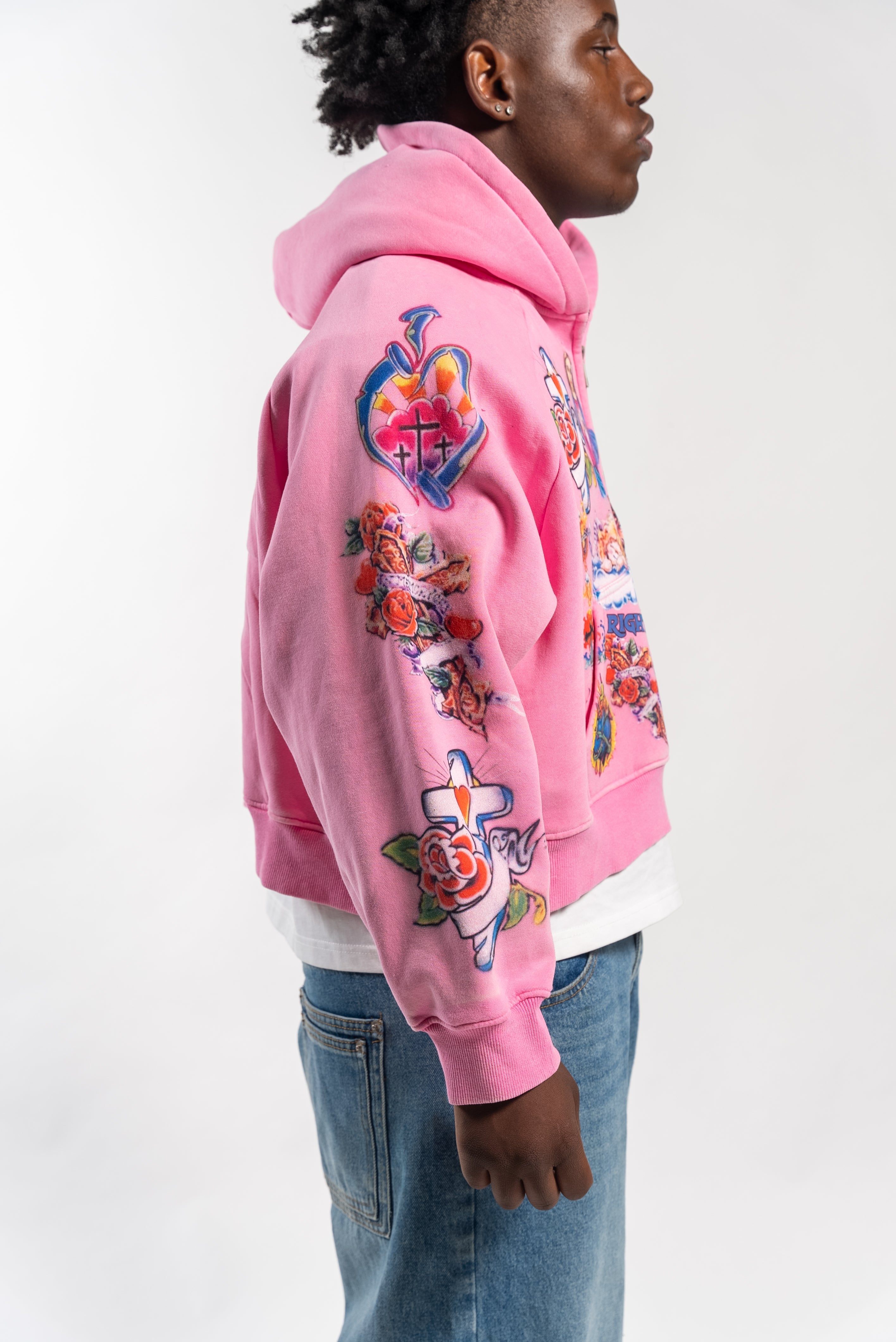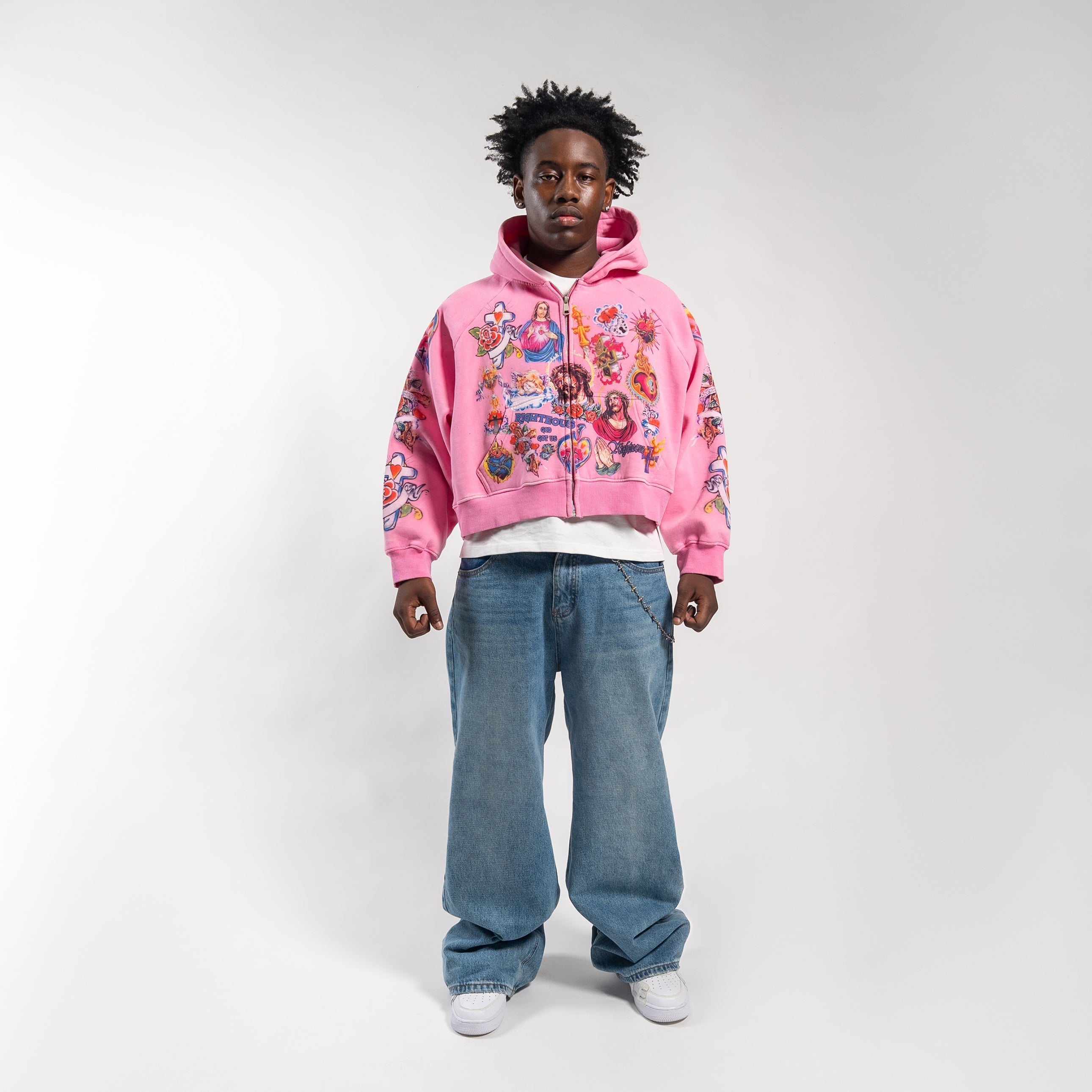 We Are Righteous 'Risen King' Cropped Zip Up Hoodie Pink